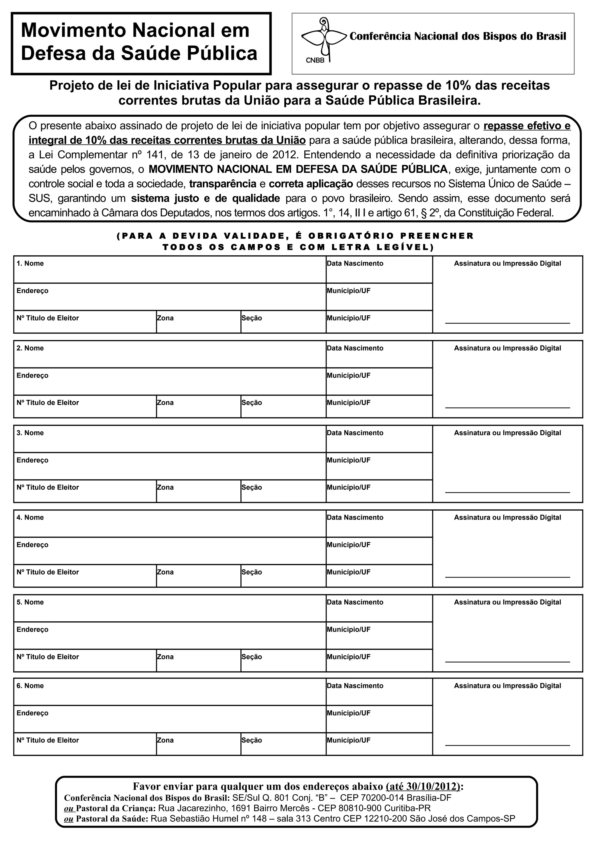 O documento propõe um projeto de lei popular para garantir que 10% das receitas da União sejam destinadas à saúde pública, alterando a lei atual. O Movimento Nacional em Defesa da Saúde Pública defende a priorização dos recursos para a saúde e seu controle social. O projeto será enviado ao Congresso Nacional.