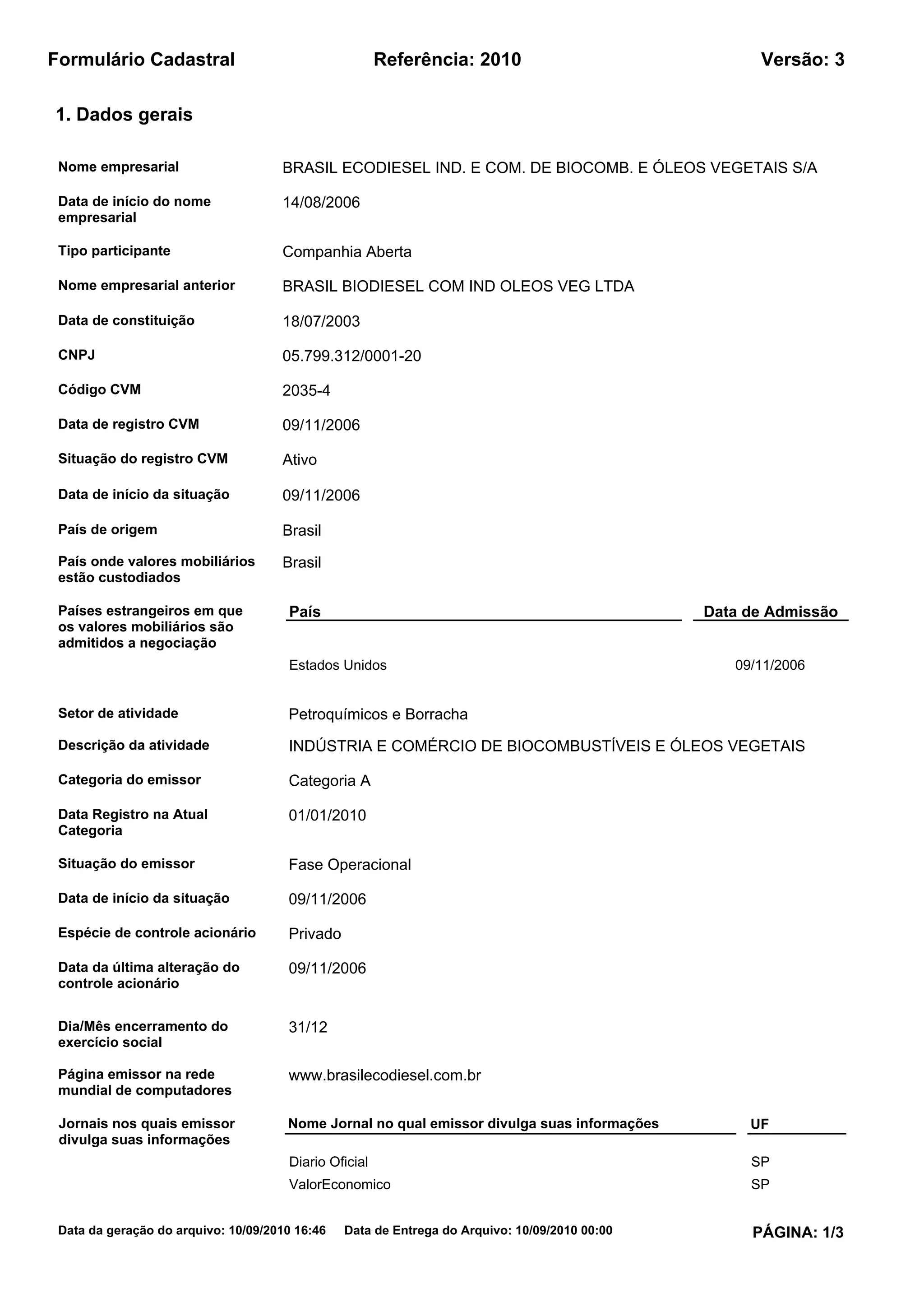 A Brasil EcoDiesel Ind. e Com. de Biocomb. e Óleos Vegetais S/A é uma companhia aberta que atua na indústria e comércio de biocombustíveis e óleos vegetais. Sua sede fica em São Paulo e suas ações são negociadas na Bolsa de Valores de São Paulo desde 2006. O documento fornece detalhes sobre a empresa, como seu histórico, dados de contato e informações sobre seus executivos e auditor.
