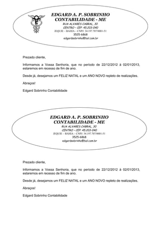 A empresa Edgard Sobrinho Contabilidade informa que ficará fechada entre 22 de dezembro de 2012 e 2 de janeiro de 2013 para o recesso de fim de ano, desejando um Feliz Natal e um próspero Ano Novo para seus clientes.
