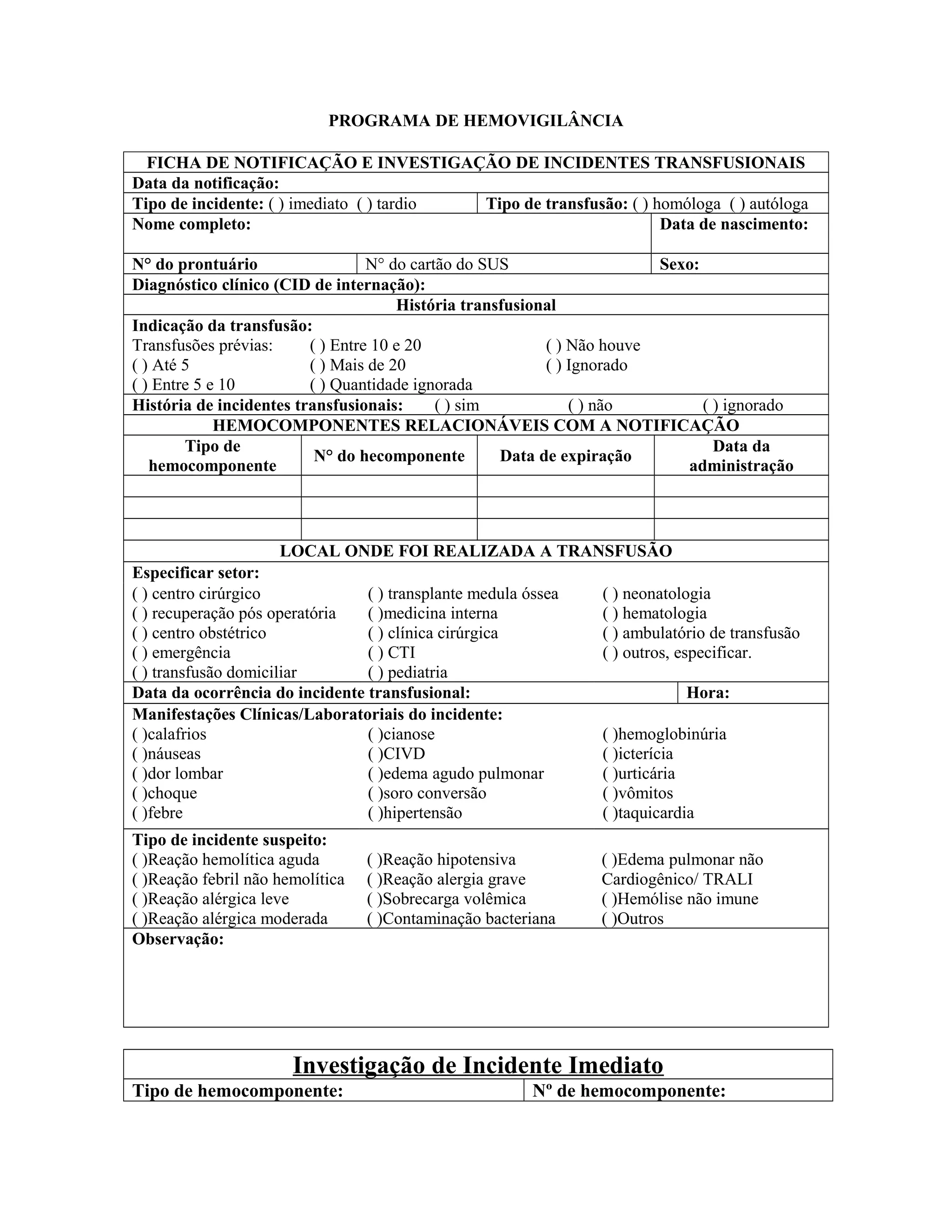 Este documento fornece um formulário padrão para notificar e investigar incidentes transfucionais. Contém seções para detalhar o paciente, os hemocomponentes administrados, os sintomas observados, exames realizados no paciente e nas bolsas, e conclusões sobre a provável causa do incidente.