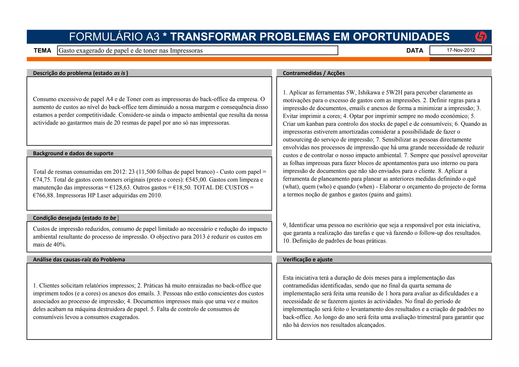 O documento aborda a questão do consumo excessivo de papel e toner nas impressoras do back-office da empresa, propondo ações como análise de causas e definição de regras para reduzir custos e impacto ambiental. Sugere-se a implementação de boas práticas, controle de estoque e possíveis opções de outsourcing. O objetivo é reduzir os custos de impressão em mais de 40% até 2013, com avaliação trimestral dos resultados.