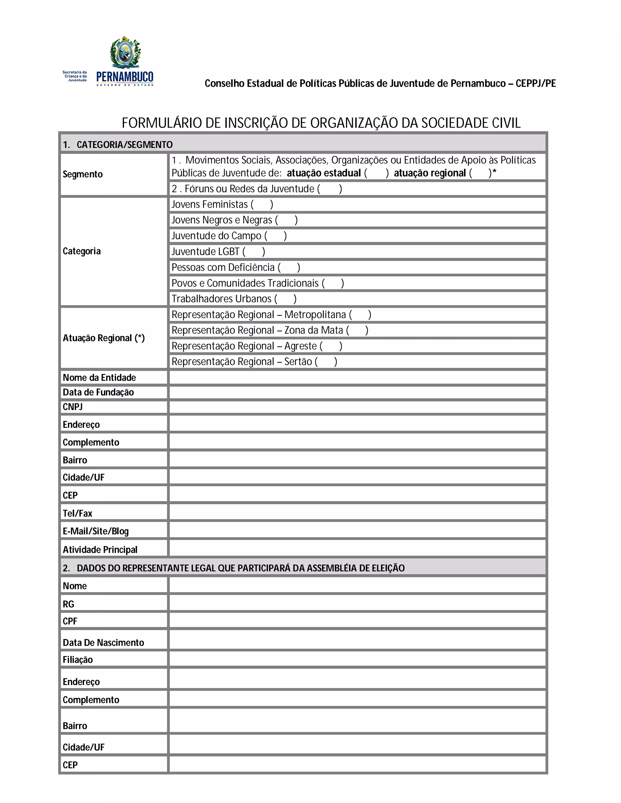 [1] O documento é um formulário de inscrição para organizações da sociedade civil participarem do Conselho Estadual de Políticas Públicas de Juventude de Pernambuco. [2] Ele solicita informações como categoria, segmento, dados da organização e do representante legal. [3] A documentação necessária inclui estatuto, ata de designação da representação, relatório de atividades e indicação formal do representante.