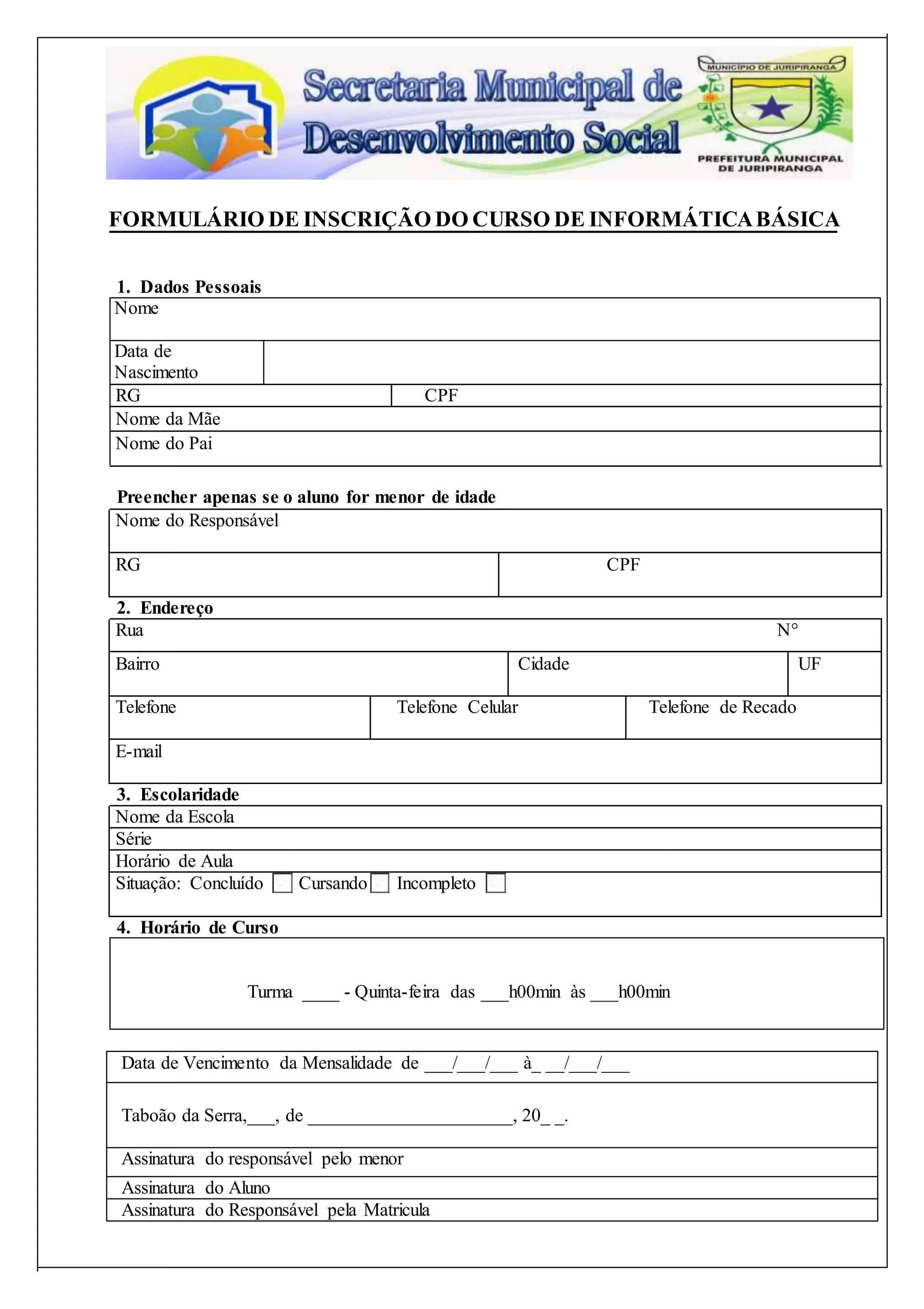 1) O documento é um formulário de inscrição para um curso de informática básica que solicita dados pessoais do aluno e do responsável, endereço, escolaridade e horário de curso preferido.