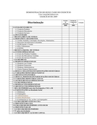 Este documento apresenta o resultado financeiro da empresa CIA VALENCIANA S/A no exercício de 2009, comparado com 2003. Apresenta o faturamento bruto, receita líquida de vendas, lucro bruto, lucro operacional, lucro líquido antes de impostos e participações, lucro líquido após impostos e participações, e lucro líquido por ação.