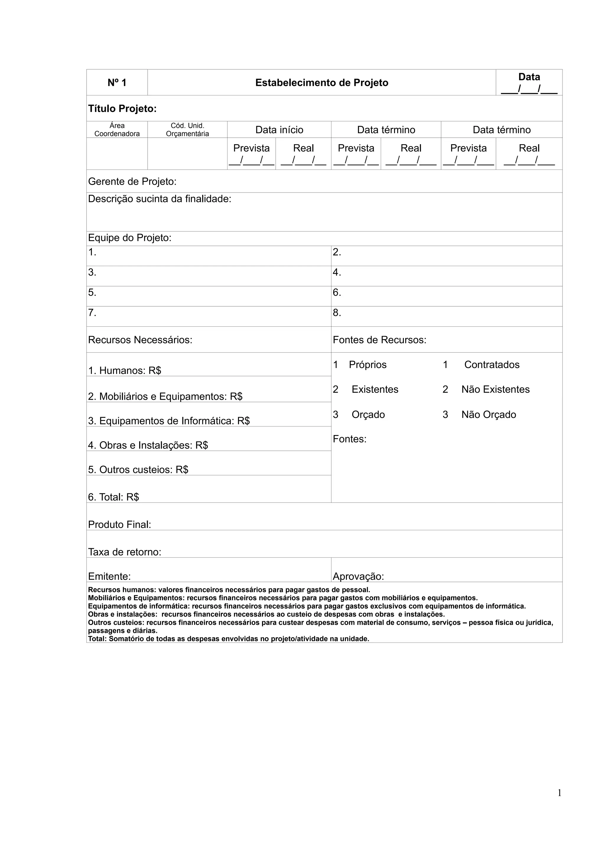 Este documento apresenta um modelo para planejamento de projetos dividido em 5 seções: 1) dados do projeto, 2) atividades, 3) recursos, 4) estimativas de custo e 5) orçamento/desembolso. A intenção é descrever o escopo, cronograma, equipe, necessidades de recursos e orçamentação de um projeto de forma sistematizada.