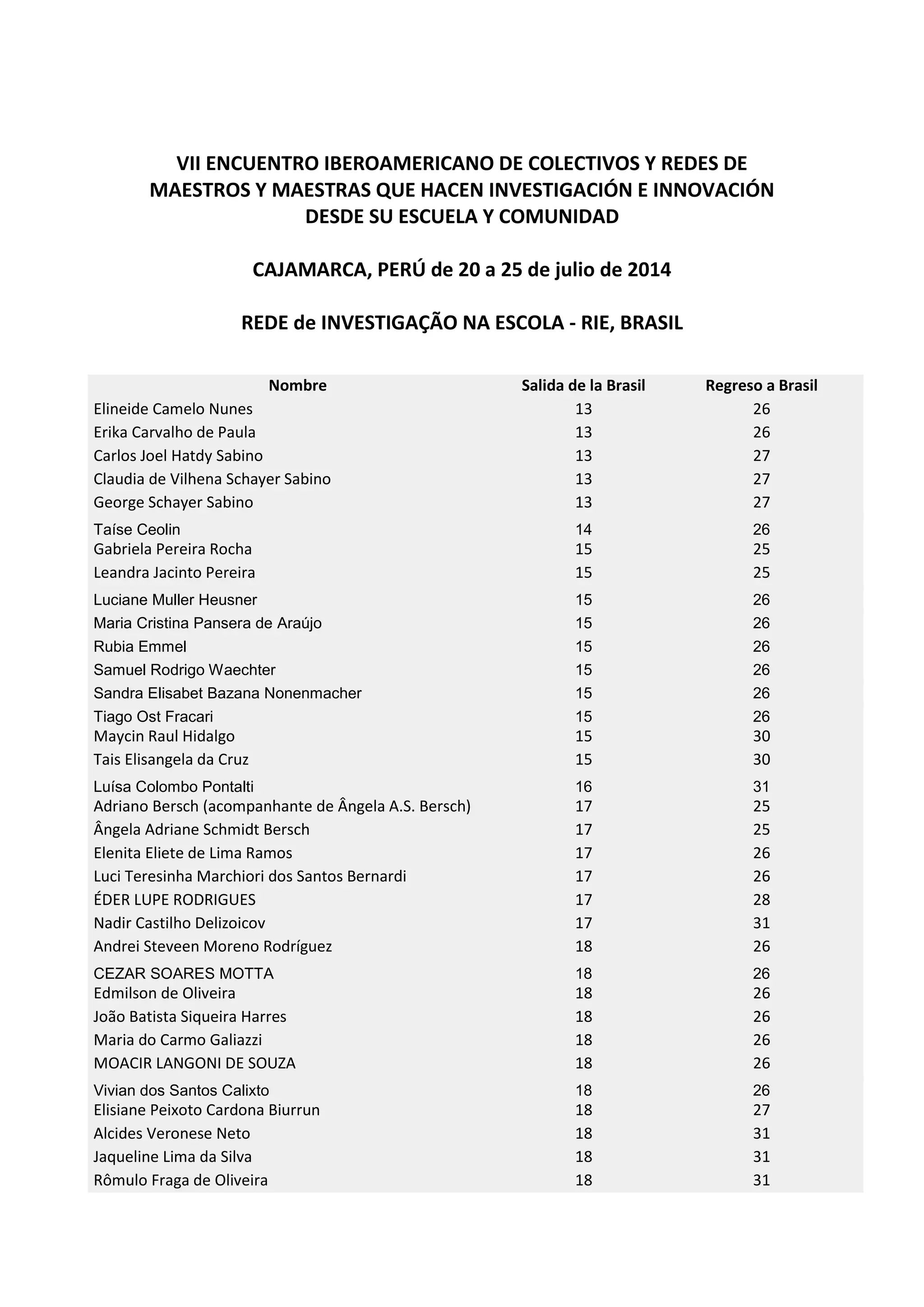 1. O documento lista os participantes da Rede de Investigação na Escola do Brasil que irão participar do VII Encontro Ibero-Americano de Coletivos e Redes de Mestres e Mestras que fazem pesquisa e inovação em suas escolas e comunidades em Cajamarca, Peru, de 20 a 25 de julho de 2014.