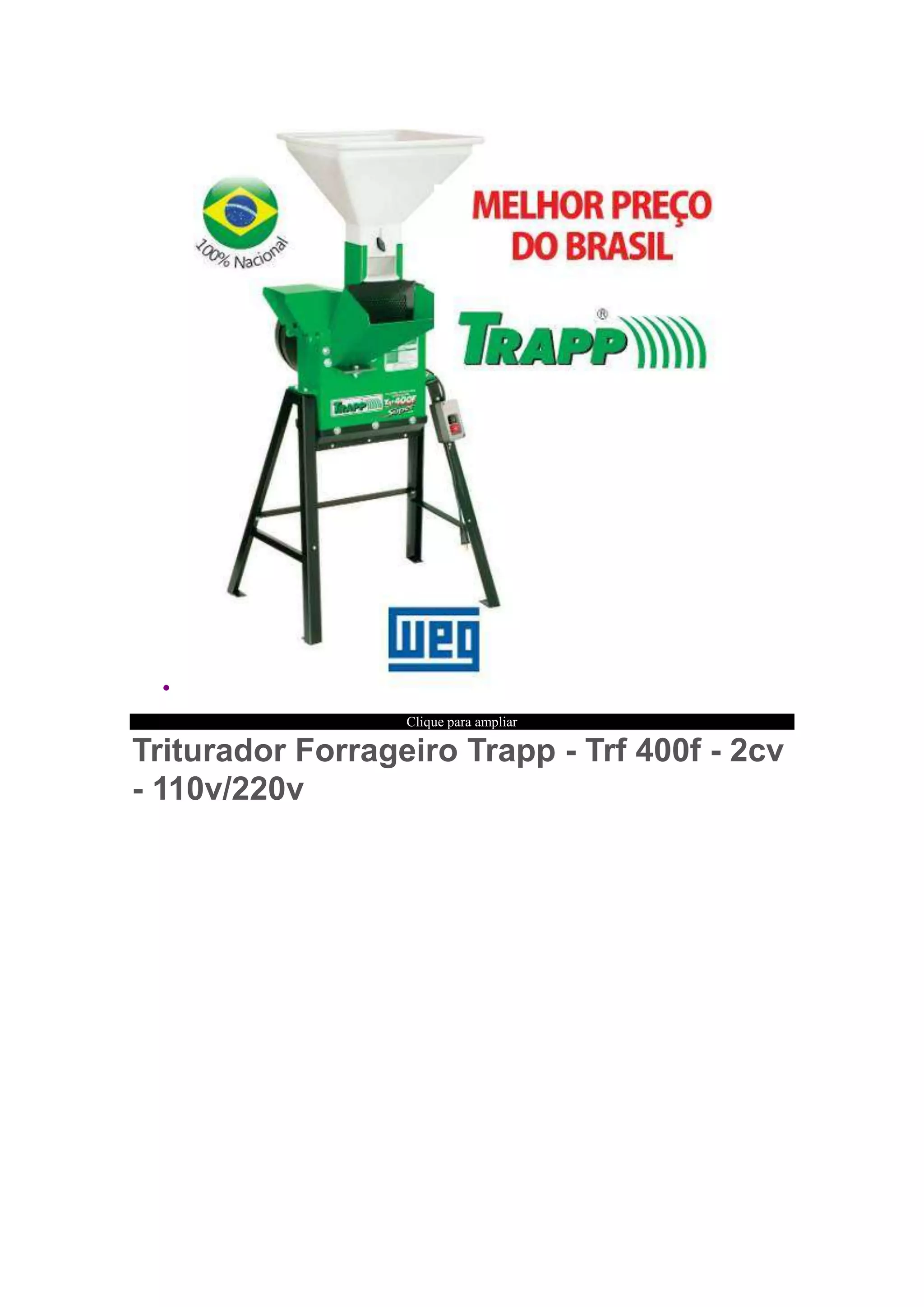 O Triturador Forrageiro Trapp - Trf 400f - 2cv é um triturador de forragem movido a eletricidade que pode operar em 110v ou 220v, sendo útil para triturar capim, feno e outros materiais de forragem para alimentação animal.