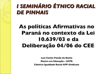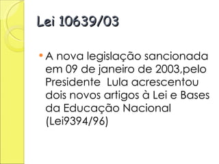 O documento discute a Lei 10.639/03 e a Deliberação 04/06 do CEE, que tornam obrigatório o ensino sobre História e Cultura Afro-brasileira nas escolas. Também aborda o racismo no Brasil e como ideologias como a da dominação racial e o mito da democracia racial contribuíram para a naturalização das desigualdades raciais no país.