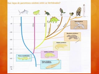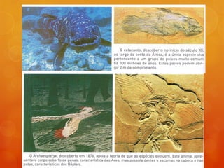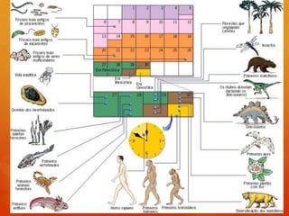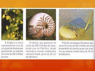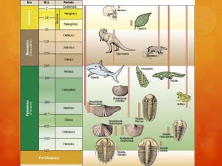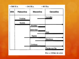 O documento discute fósseis, incluindo o que são fósseis, como se formam, os tipos de informações que fornecem sobre o passado da Terra, e como são usados na datação de rochas e estratos.