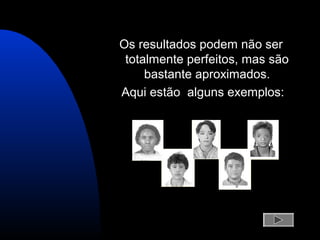Este documento descreve um programa de foto automática que gera uma foto de uma pessoa com base em respostas a perguntas sobre características faciais e físicas. O documento lista várias perguntas sobre detalhes como cor de cabelo, cor dos olhos, forma do nariz e inclui uma mensagem sobre a aceitação de si mesmo e a fé em Deus.