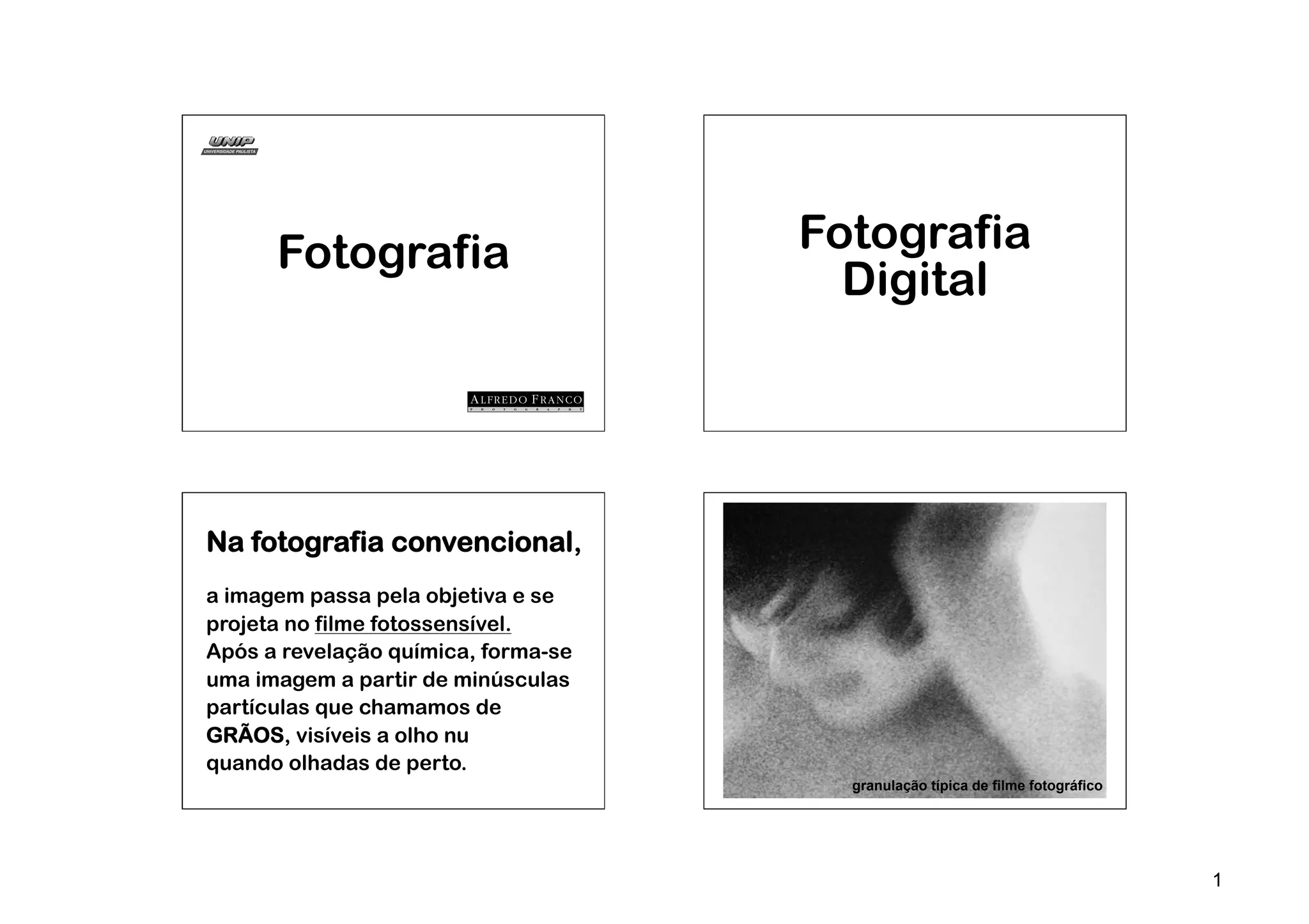 A fotografia digital captura imagens usando um sensor eletrônico composto por minúsculos pixels ao invés de grãos em um filme. O tamanho do sensor, medido em megapixels, afeta diretamente a qualidade da imagem, com mais pixels fornecendo maior resolução. A resolução necessária depende do uso final da imagem, como impressão ou exibição em telas.