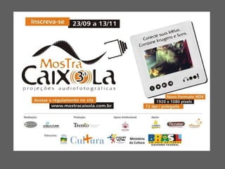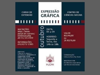 O documento descreve um curso básico de fotografia oferecido pela Escola Portfolio com 48 horas de aula entre 30 de setembro e 20 de novembro, abordando tópicos técnicos e conceituais da fotografia. Também anuncia o II Simpósio de Fotografia e Cultura Visual nos dias 22 e 23 de outubro na Unisul de Florianópolis com palestrantes convidados.