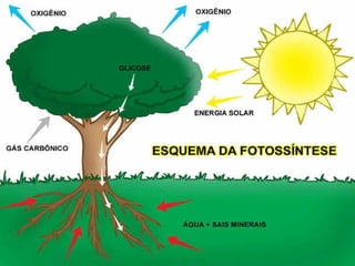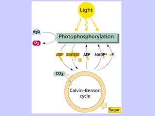 O documento descreve os processos da fotossíntese em plantas. A fotossíntese ocorre em dois estágios: a etapa fotoquímica, onde a luz é absorvida pela clorofila para produzir ATP e NADPH; e a etapa química sem luz, onde o CO2 é fixado usando ATP e NADPH para produzir glicose. O documento também descreve os componentes dos cloroplastos onde ocorre a fotossíntese e as reações envolvidas na quebra da água e produ