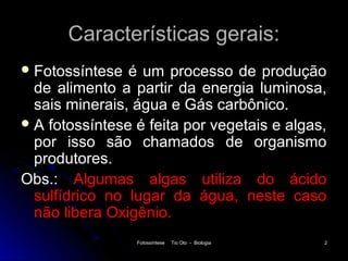 O documento descreve o processo de fotossíntese em plantas e algas. A fotossíntese converte a energia luminosa, dióxido de carbono, água e sais minerais em açúcares, como a glicose, liberando oxigênio. O processo ocorre em duas fases, a clara e a escura. A fase clara produz ATP e NADPH a partir da luz, enquanto a fase escura fixa o carbono em compostos orgânicos usando esses produtos químicos.
