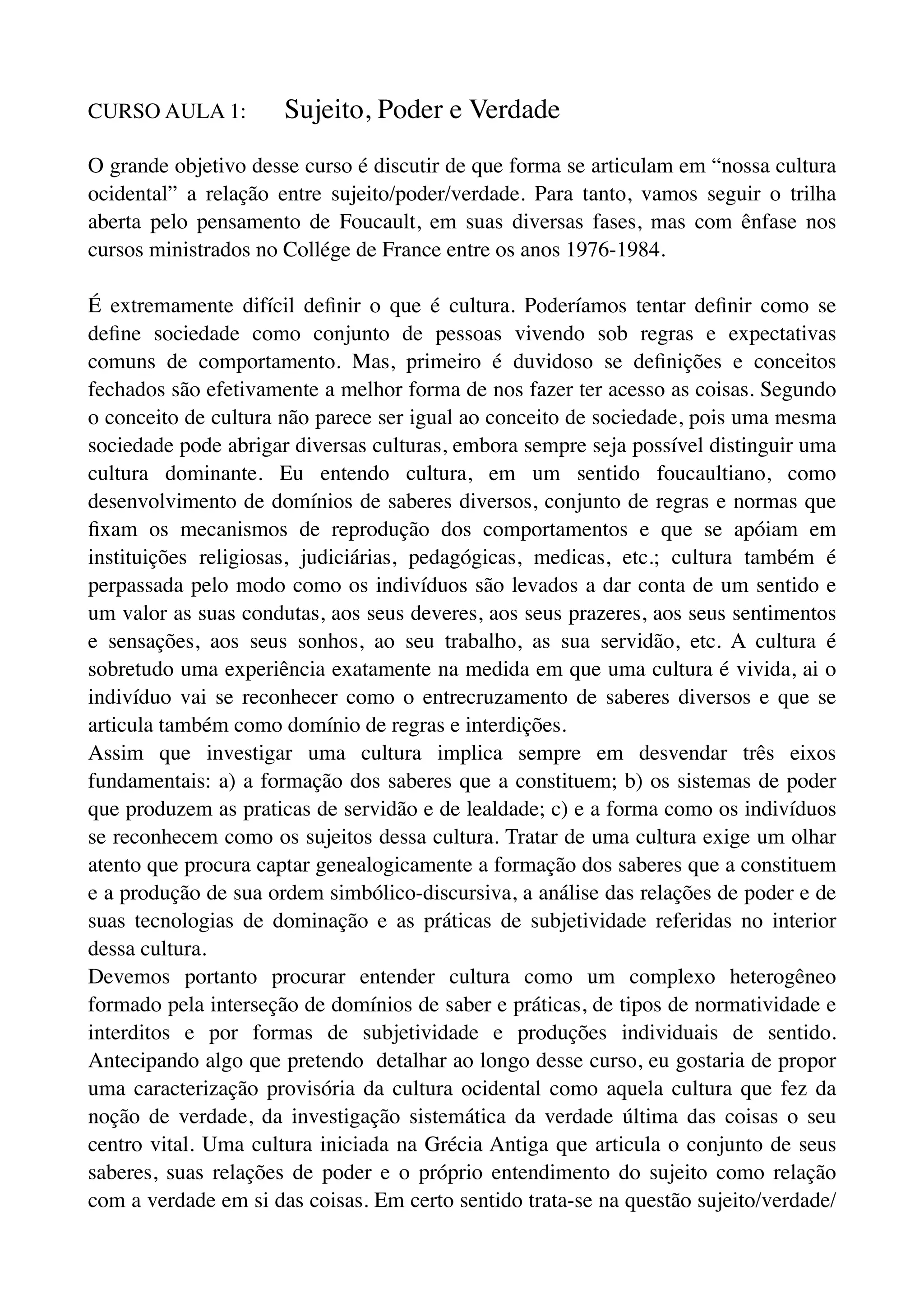 O documento discute o curso "Sujeito, Poder e Verdade" que analisa como esses conceitos se articulam na cultura ocidental segundo o pensamento de Foucault. Aborda a definição de cultura, investigação de culturas e como Foucault analisou sistemas de pensamento, envolvendo mentalidades, representações e produção de verdade.