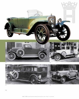 Os primeiros anos - Horch, onde a lenda começou. August Horch fundou a August Horch & Cie em 1899 e estabeleceu as bases para a indústria automobilística alemã. Após deixar a empresa em 1909, Fritz Seidel e Heinrich Paulmann deram continuidade ao seu legado, mantendo a ênfase na qualidade e resistência dos veículos Horch.