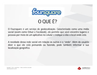O documento descreve o serviço Foursquare, uma rede social baseada em geolocalização que permite aos usuários indicar sua localização e compartilhar informações sobre lugares visitados. Ele explica como o Foursquare funciona, como empresas usam a plataforma para promoções e como o governo chinês bloqueou o acesso devido a protestos na praça da Paz Celestial.