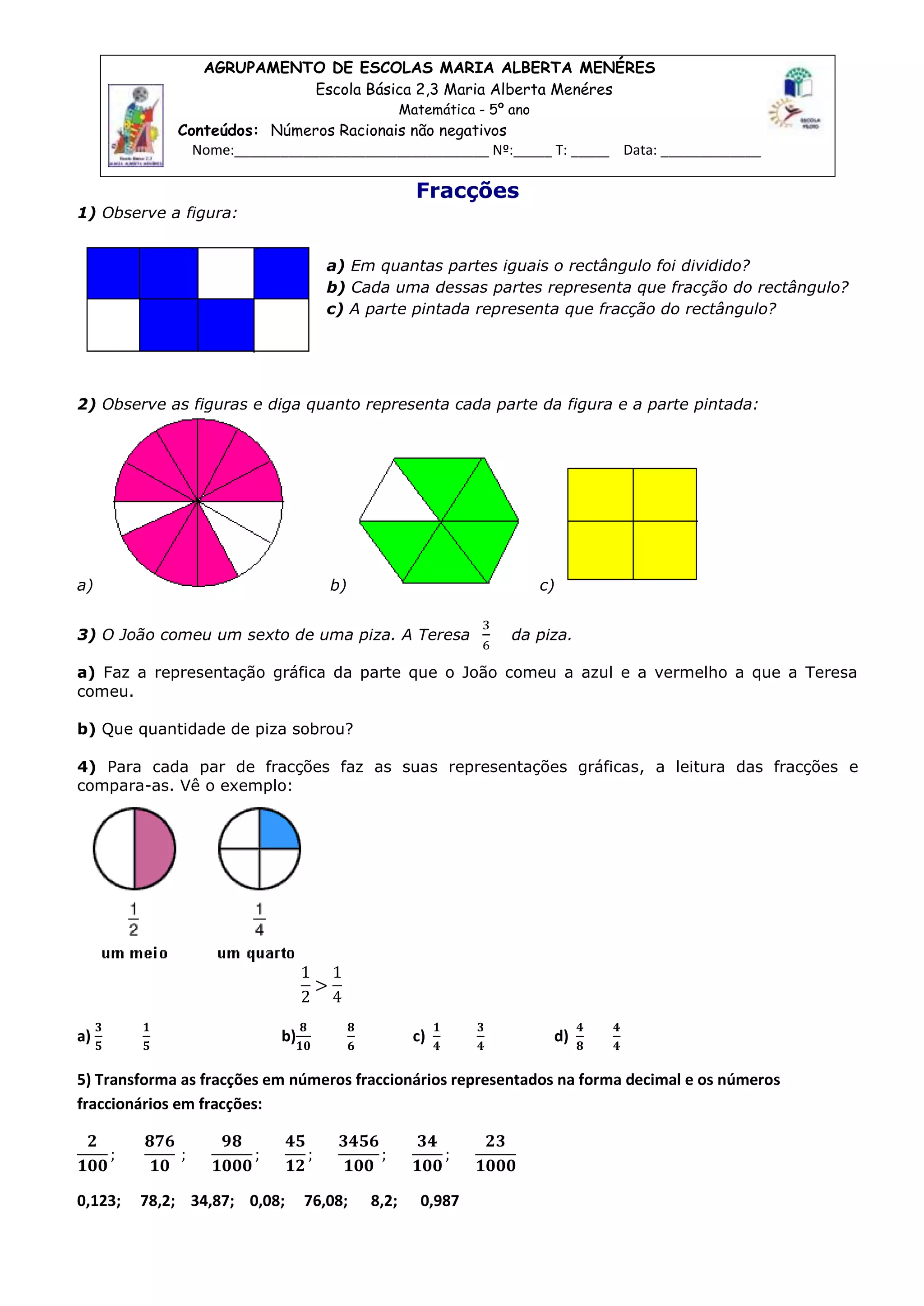 1) O documento apresenta exercícios sobre frações para alunos do 5o ano. 2) Os exercícios incluem representar frações em figuras geométricas, comparar frações, converter entre frações e números fracionários decimais. 3) São fornecidos exemplos para guiar os alunos na resolução dos exercícios.