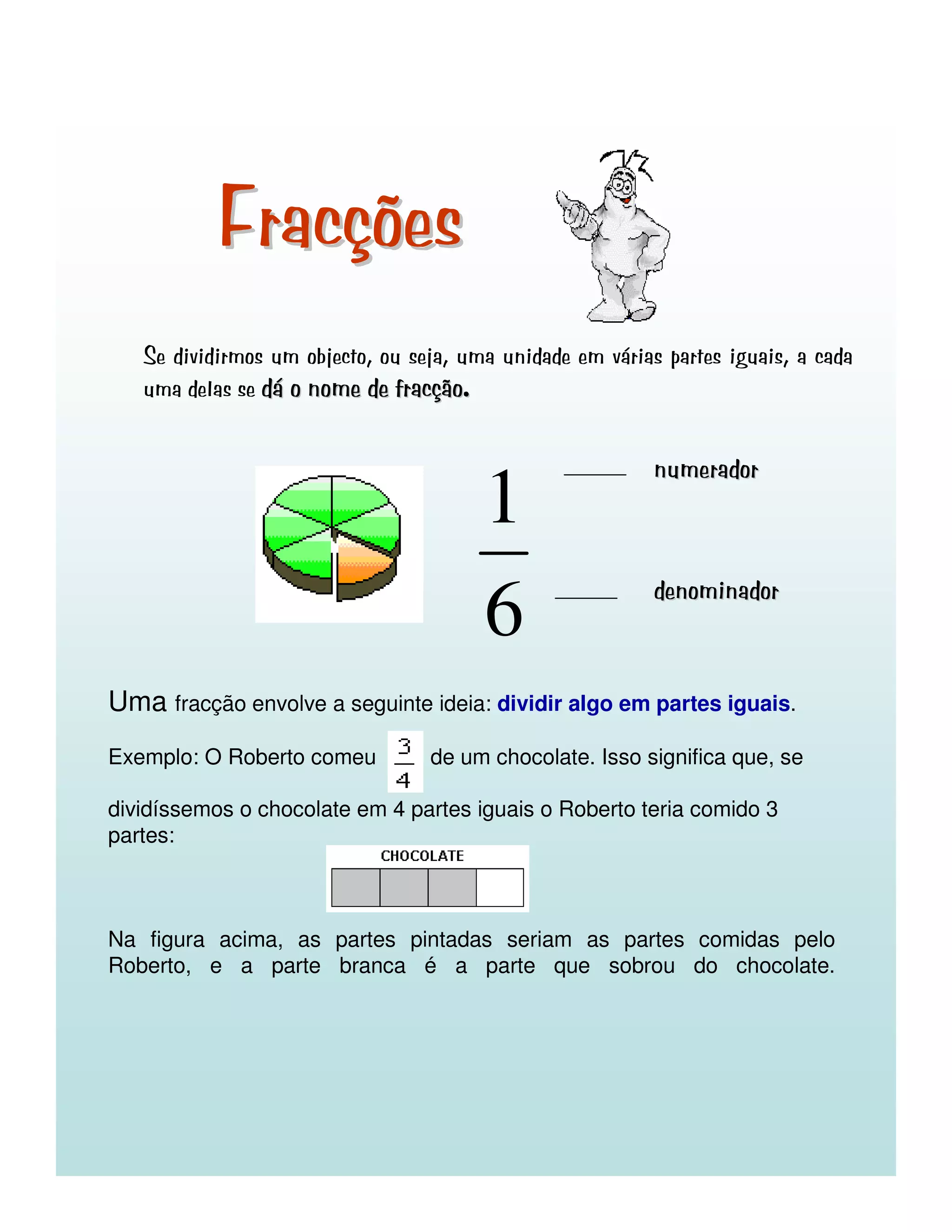 1) O documento discute fracções, que representam a divisão de um objeto ou unidade em partes iguais. 2) Fracções decimais têm denominadores que são potências de 10. 3) É possível representar números decimais como fracções decimais dividindo-se o número inteiro pelo denominador com os zeros correspondentes às casas decimais.