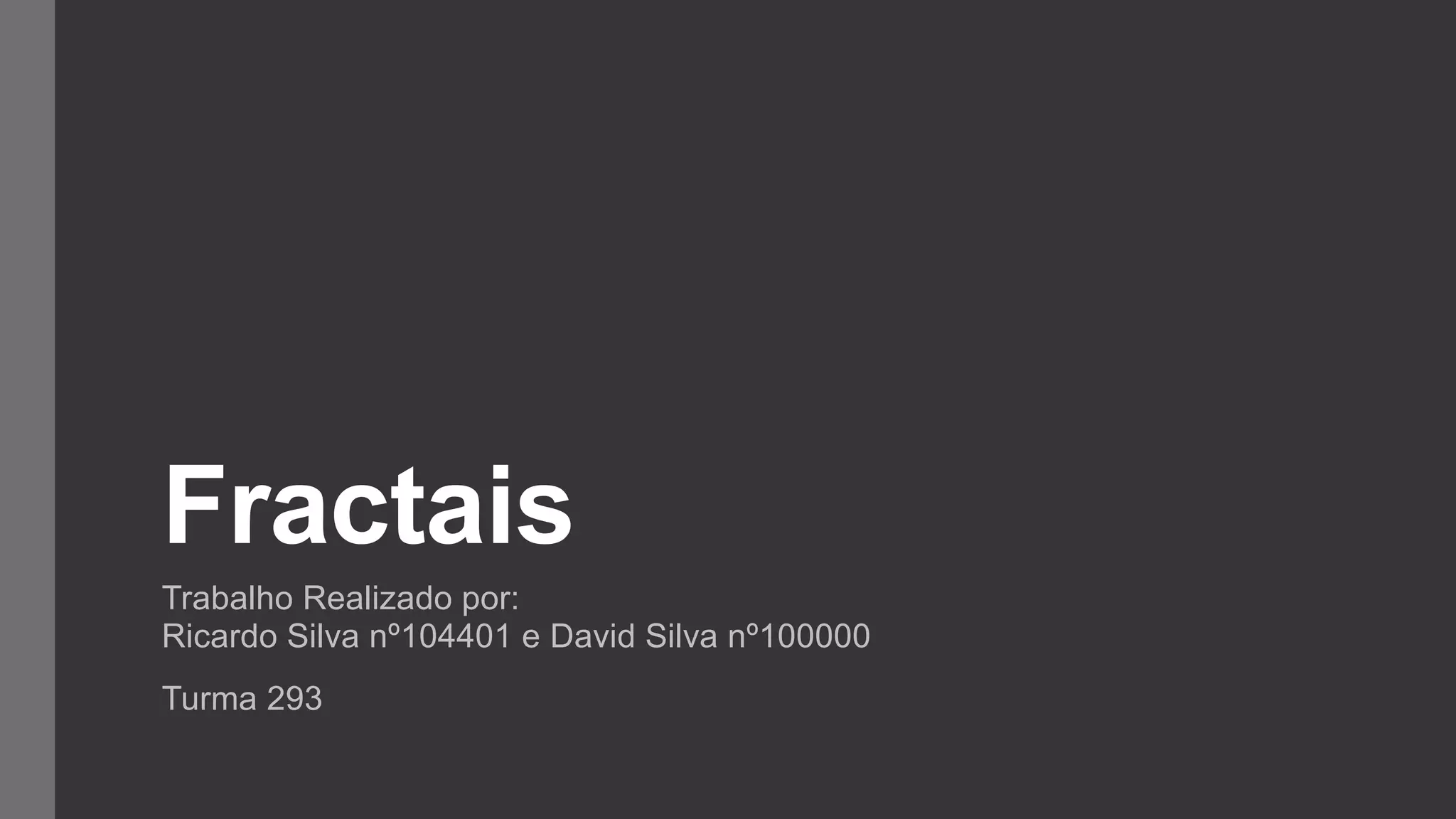 O documento descreve o que são fractais, sua história e exemplos. Fractais são objetos geométricos que mantêm sua estrutura em qualquer escala e possuem dimensões fracionárias. Sua ideia surgiu entre 1857-1913 com Weierstrass e Koch, mas foi Benoît Mandelbrot quem criou o termo "fractal" e estudou muitos exemplos como o conjunto de Mandelbrot.