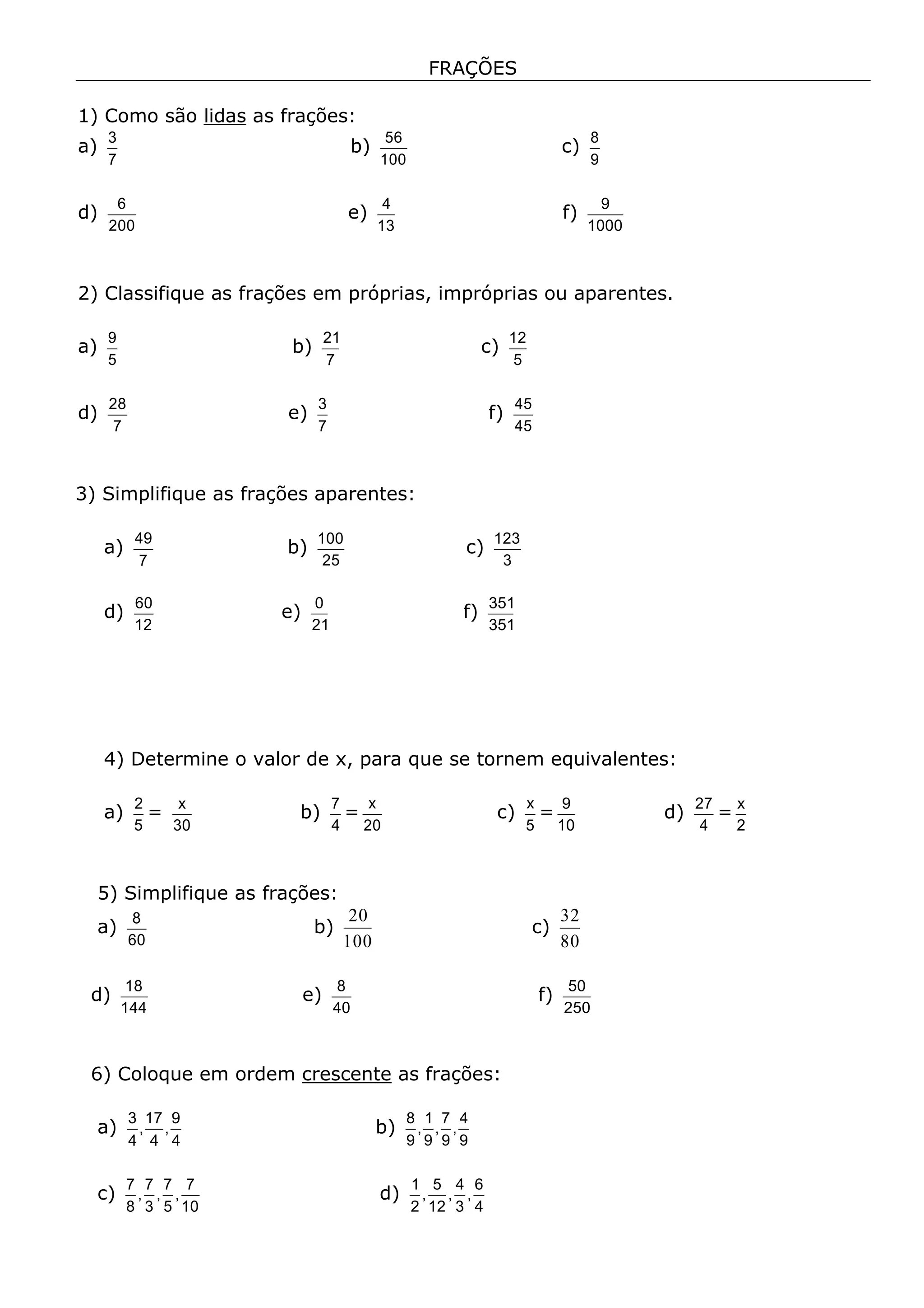 1) O documento apresenta exercícios sobre frações, incluindo leitura, classificação, simplificação e operações com frações.