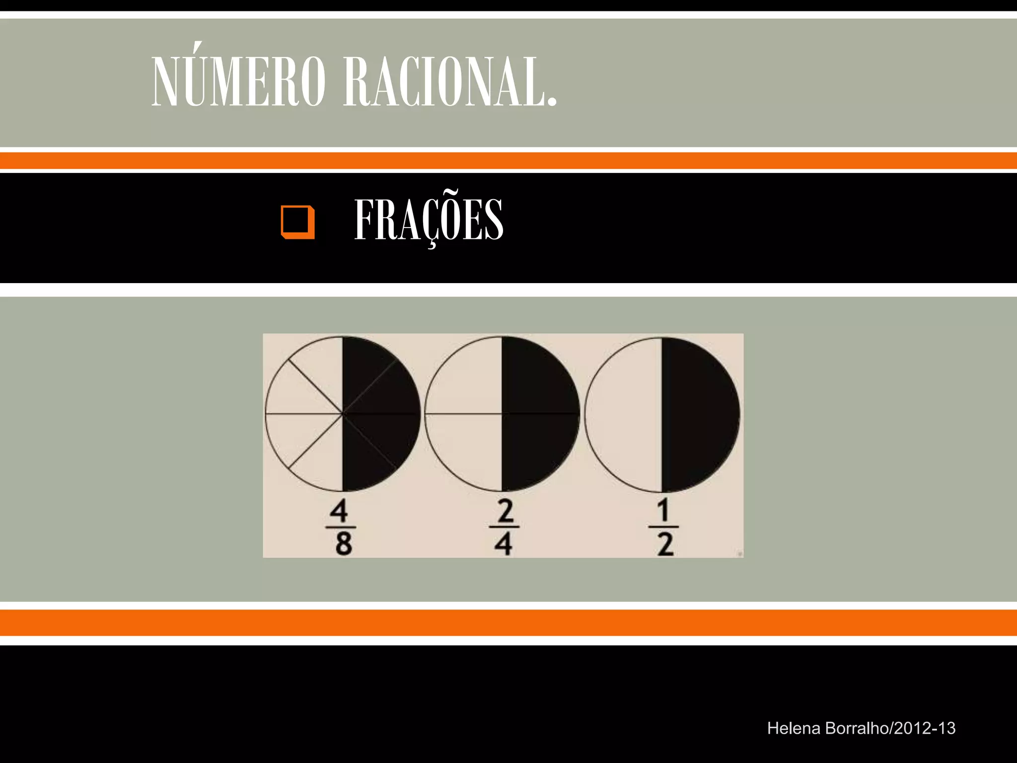 O documento discute os números racionais, incluindo frações, números fracionários e decimais. Explica que uma fração representa uma ou mais partes de uma unidade dividida em partes iguais e define os termos numerador e denominador. Também define o conjunto dos números racionais Q e explica como todo número racional pode ser representado por uma fração.