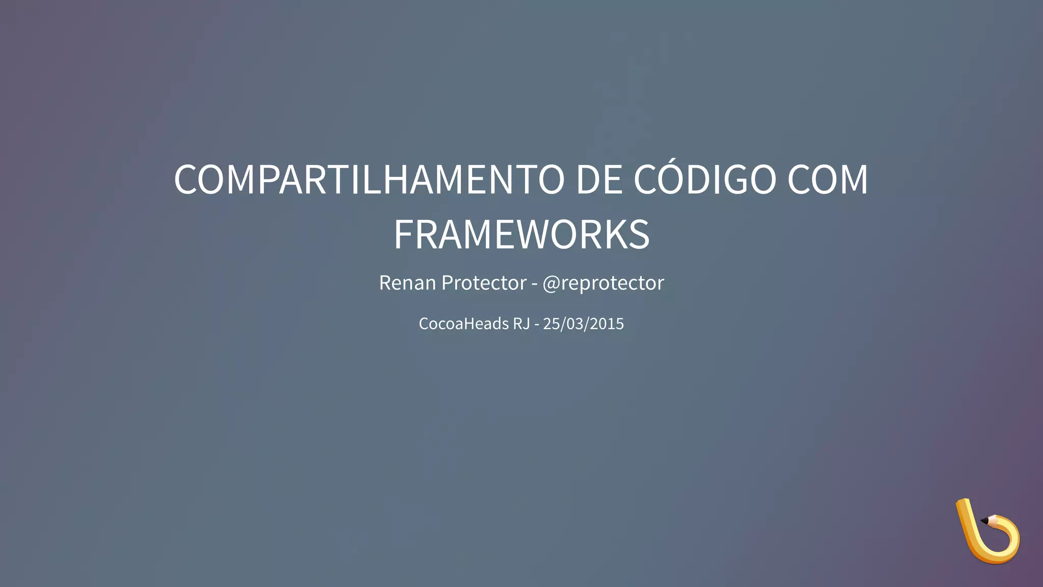 O documento discute o compartilhamento de código usando frameworks no desenvolvimento para iOS e OS X, apresentado por Renan Protector durante o CocoaHeads RJ. Ele detalha a definição de um framework, a importância da visibilidade de classes e as melhores práticas para otimização e organização de projetos. Além disso, menciona a necessidade de cuidado ao utilizar shimming em códigos extensivos e conclui com uma chamada para contratações na empresa.