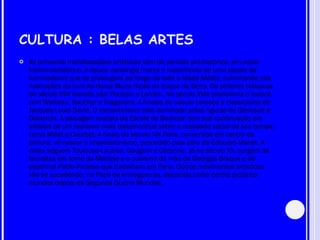 CULTURA : BELASARTES As primeiras manifestações artísticas vêm do período pré-histórico, em estilo franco-cantábrico. A época carolíngia marca o nascimento de uma escola de iluminadores que se prolongará ao longo de toda a Idade Média, culminando nas ilustrações do livro As Horas Muito Ricas do duque de Berry. Os pintores clássicos do século XVII francês são: Poussin e Lorrain. No século XVIII predomina o rococó, com Watteau, Boucher e Fragonard. A finales do século começa o classicismo de Jacques-Louis David. O romanticismo está dominado pelas figuras de Géricault e Delacroix. A paisagem realista da Escola de Barbizon tem sua continuação em artistas de um realismo mais testemunhial sobre a realidade social de seu tempo, como Millet e Courbet. A finais do século XIX Paris, convertida em centro da pintura, vê nascer o impressionismo, precedido pela obra de Édouard Manet. A estes seguem Toulouse-Lautrec, Gauguin e Cézanne. Já no século XX, surgem os fauvistas em torno da Matisse e o cubismo da mão de Georges Braque e do espanhol Pablo Picasso que trabalham em Paris. Outros movimentos artísticos vão se sucedendo, na Paris de entreguerras, decaindo como centro pictórico mundial depois da Segunda Guerra Mundial.