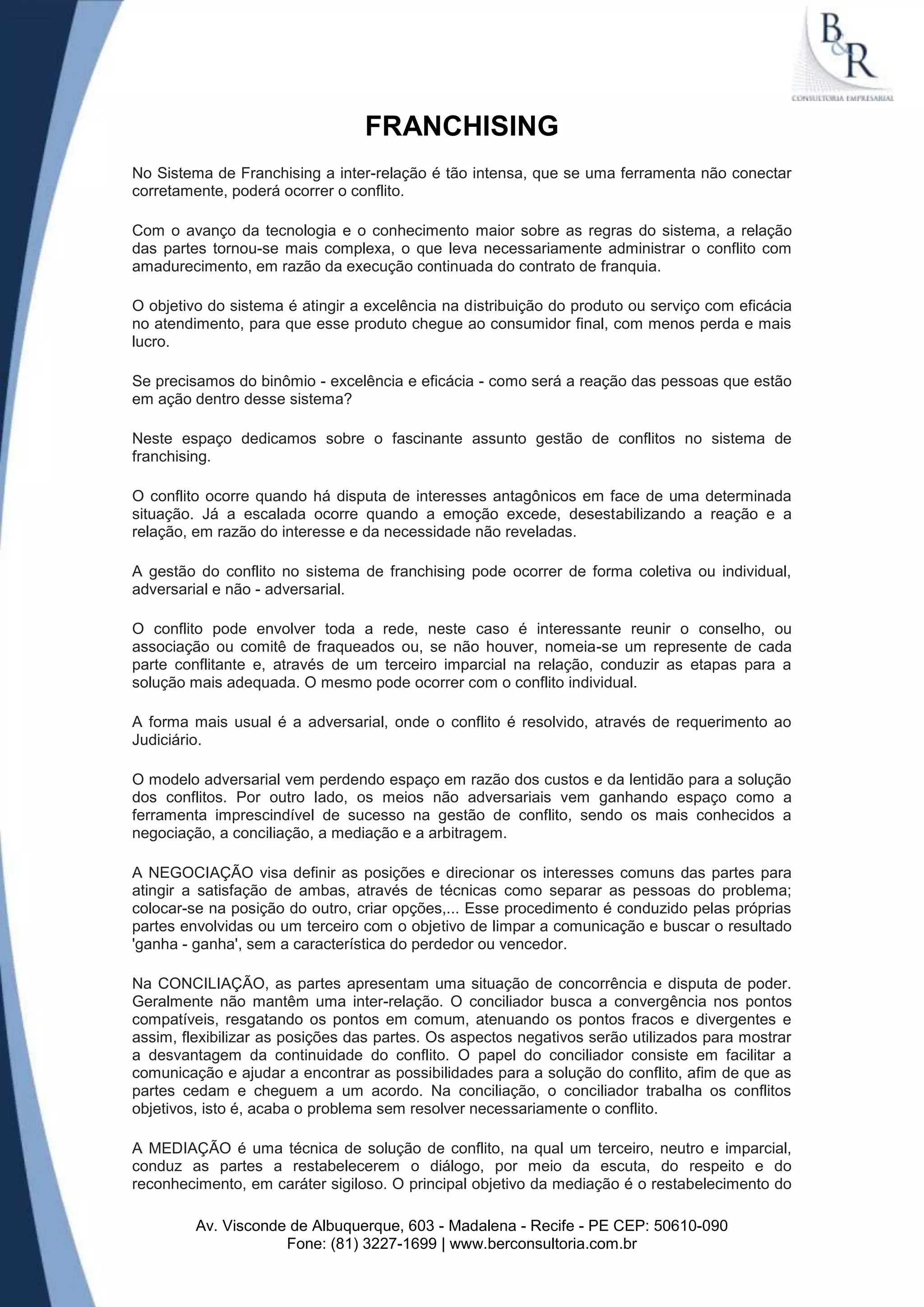 O documento discute a gestão de conflitos no sistema de franchising. Explica que o conflito pode envolver toda a rede ou ser individual, e que pode ser resolvido de forma adversária ou não-adversária através de negociação, conciliação, mediação ou arbitragem. A arbitragem é apresentada como uma opção eficaz, rápida e econômica para resolver conflitos no franchising.