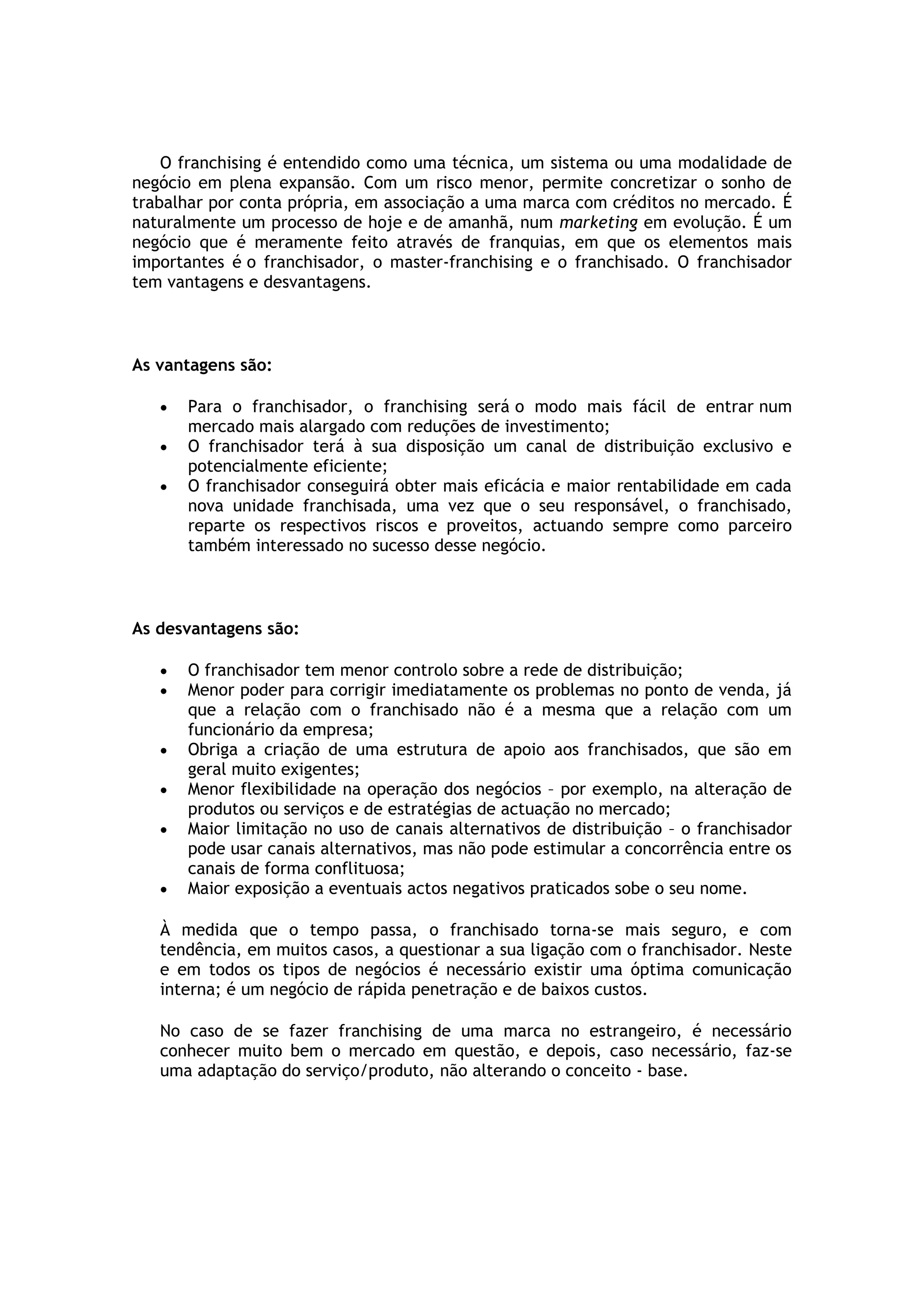 O franchising permite expandir um negócio com menor risco através de franquias, onde franqueados trabalham sob uma marca estabelecida. Oferece vantagens como redução de custos de entrada em novos mercados para o franqueador, enquanto os franqueados podem realizar seu sonho de ter seu próprio negócio. No entanto, o franqueador tem menos controle e pode enfrentar questões com franqueados insatisfeitos.