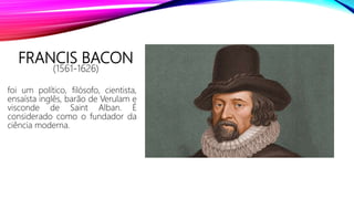 Francis Bacon foi um filósofo inglês que defendeu um método indutivo para a investigação científica, criticando os filósofos clássicos e medievais por extraírem teorias apenas de seus intelectos sem observação da natureza. Bacon propôs o método científico de observação sistemática dos fatos, hipóteses e testes empíricos para descoberta de leis naturais, influenciando as práticas científicas modernas.