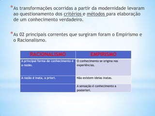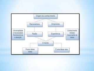 O documento discute as correntes do racionalismo e empirismo na modernidade. O racionalismo defende a razão como fonte do conhecimento, enquanto o empirismo defende a experiência. Filósofos como Descartes, Locke e Hume contribuíram para essas teorias do conhecimento.