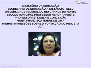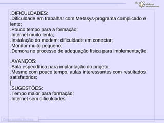 Este documento descreve as impressões de uma pessoa sobre o projeto UCA. Ele lista as principais dificuldades enfrentadas, como trabalhar com um programa complicado e lento e ter pouco tempo para formação. Também reconhece alguns avanços, como ter uma sala específica para o projeto e aulas interessantes apesar do pouco tempo. Sugere que seja dado mais tempo para formação e uma internet sem problemas.