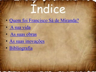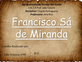 Francisco Sá de Miranda foi um poeta português do século XVI que introduziu novas formas literárias como o decassílabo e a comédia em prosa. Sá de Miranda defendeu valores como o viver simples no campo em oposição à vida de luxo na corte e escreveu sobretudo poemas e cantigas, sendo as suas obras mais famosas o Cancioneiro de Resende e a Vida.