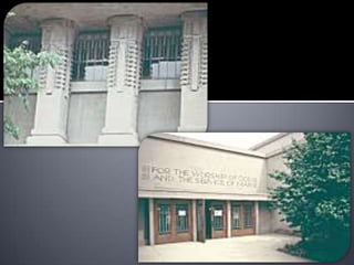 Frank Lloyd Wright (1867-1959) foi um arquiteto estadunidense considerado um dos mais importantes do século XX. Ele desenvolveu mais de 1000 projetos ao longo de sua carreira, destacando-se por casas, igrejas, museus e escritórios projetados com base em sua arquitetura orgânica. Alguns de seus principais projetos incluem a Casa da Cascata, o Museu Guggenheim e a Sinagoga Beth Sholom.