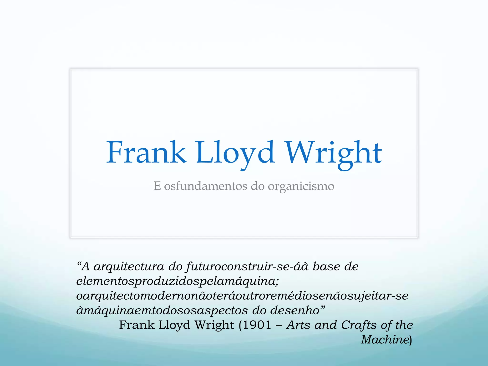 O documento descreve os fundamentos do organicismo na arquitetura moderna defendido por Frank Lloyd Wright e Alvar Aalto. Apresenta as características das casas de Wright como a simplicidade formal, predominância de linhas horizontais e a importância da chaminé. Também destaca obras emblemáticas como Falling Water e o Museu Guggenheim que exploram a harmonia com a natureza prezando a escala humana.