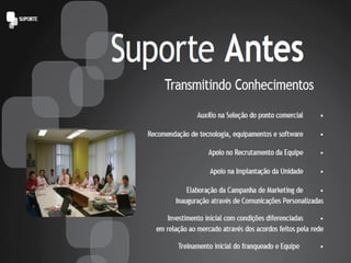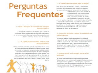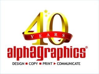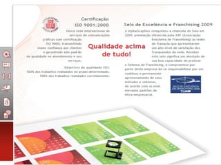 O documento descreve a AlphaGraphics, uma empresa de serviços gráficos presente em 22 unidades no Brasil e mais de 300 unidades em 11 países. A AlphaGraphics oferece qualidade, diversidade de produtos e suporte à rede de franqueados. O documento também fornece detalhes sobre o mercado em expansão, características, depoimentos de franqueados e o processo para se tornar um franqueado.