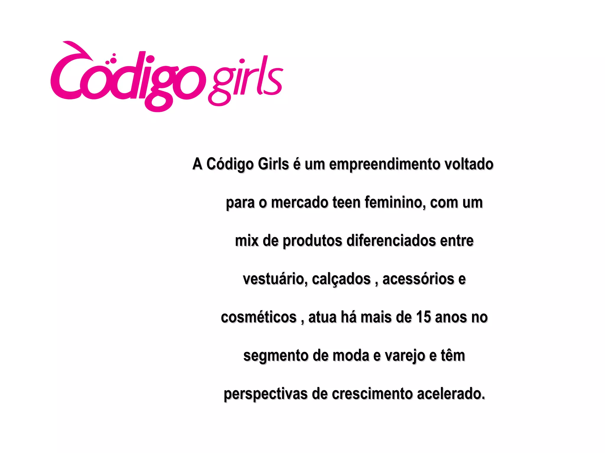 A Código Girls é uma empresa de moda feminina teen com mais de 15 anos no mercado. Ela possui mais de 20 lojas próprias e franquias em São Paulo e outros estados, além de uma fábrica que produz mais de 50 mil peças por ano. A empresa oferece franquias com investimentos a partir de R$30 mil, voltadas para empreendedores iniciantes.