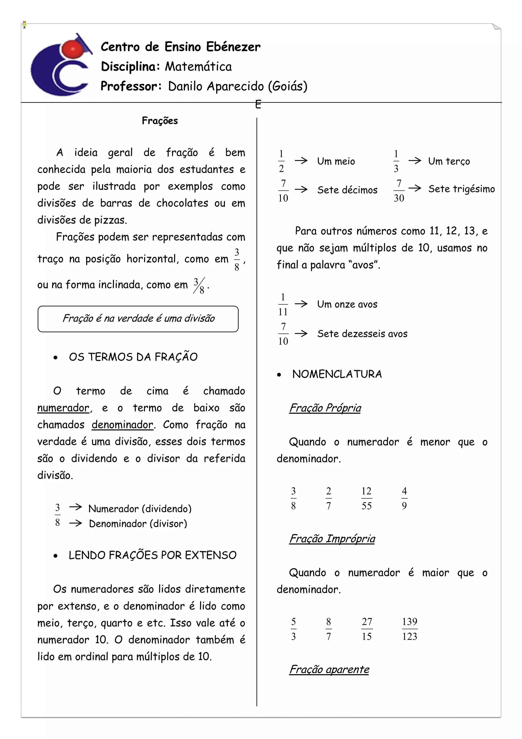 O documento fornece uma introdução sobre frações, definindo seus termos principais como numerador e denominador. Explica como ler frações por extenso para números até 10 e como ler os múltiplos de 10. Também define os tipos de frações como própria, imprópria e aparente. Por fim, diferencia frações decimais e ordinárias.