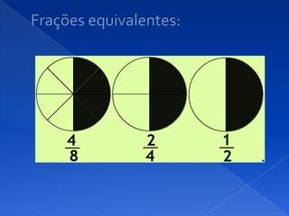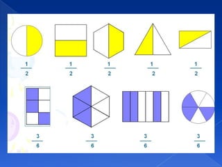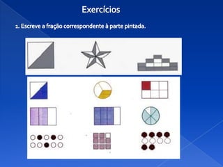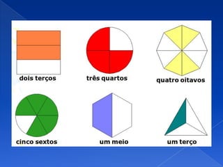 O documento discute frações racionais não negativas. Explica que uma fração representa uma quantidade através de um quociente entre o numerador e o denominador, e fornece exemplos de como ler e escrever frações com denominadores menores ou maiores que 10.
