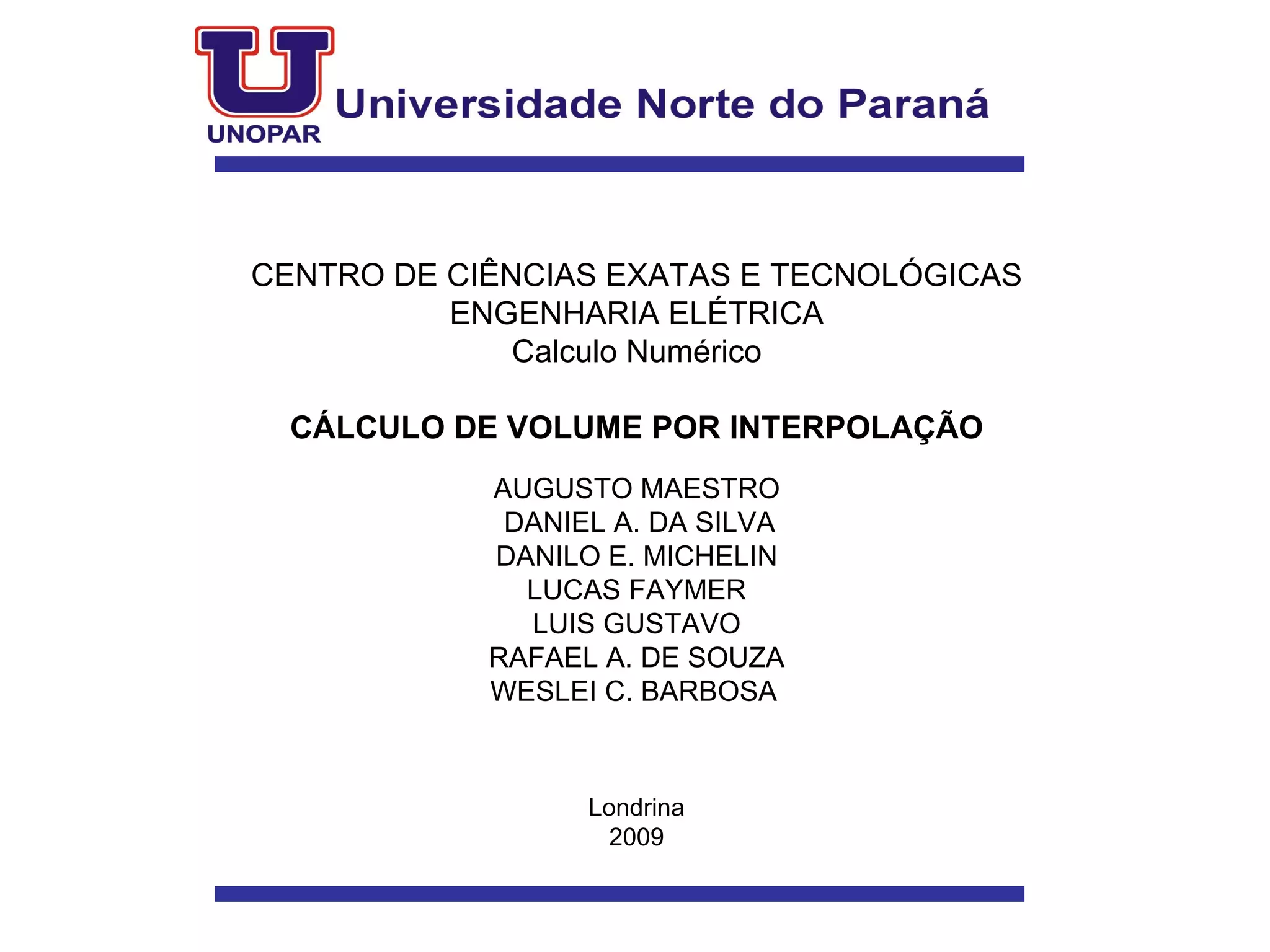 Este documento descreve o cálculo do volume de um frasco de leite fermentado usando interpolação de Lagrange. Fornece valores medidos de altura e raio em pontos ao longo do frasco e descreve os cálculos de interpolação realizados para aproximar a forma do frasco e calcular o volume total em aproximadamente 80 ml, com precisão de 0,8% em relação ao valor medido experimentalmente.