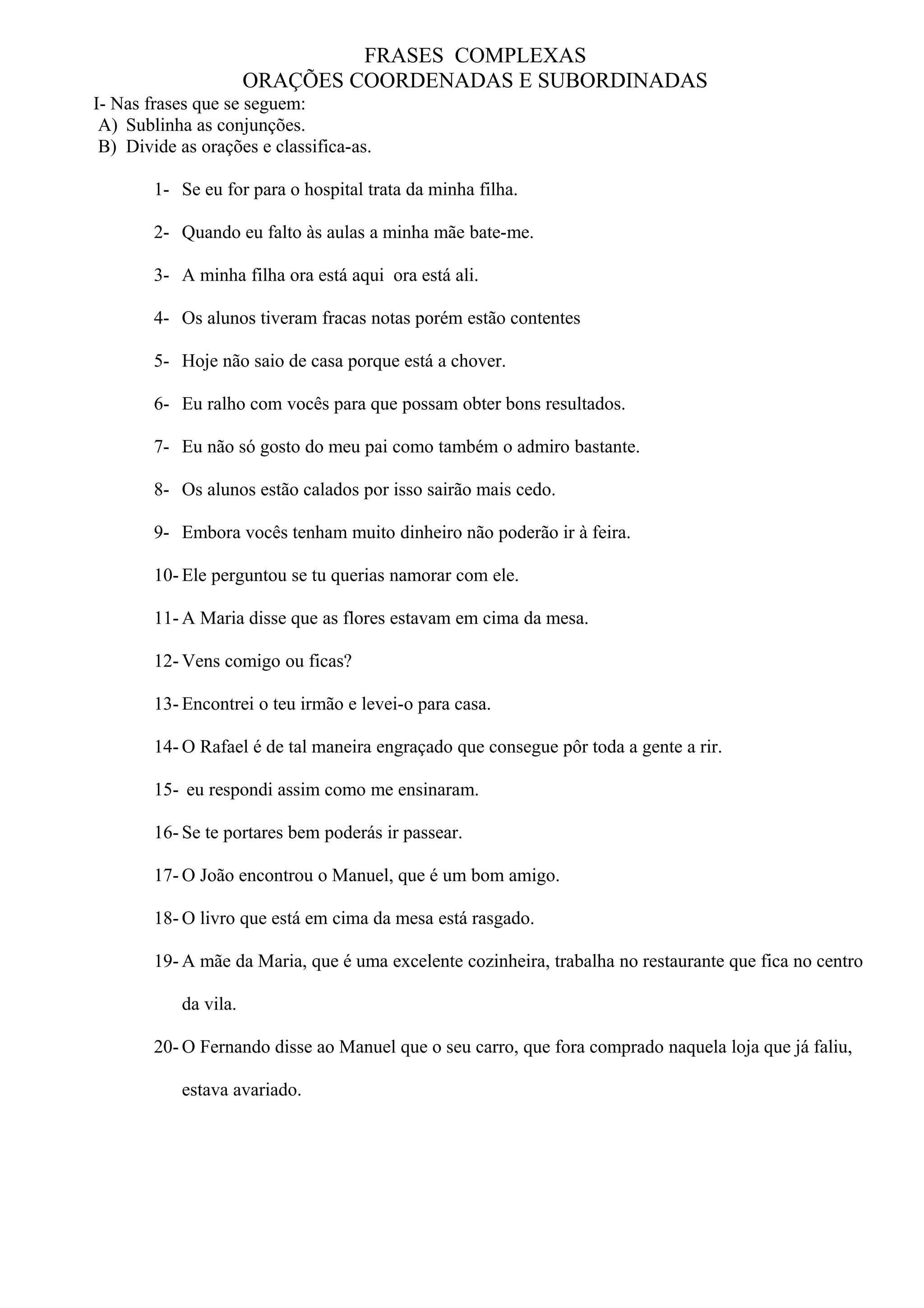 1) O documento apresenta 15 frases e pede para: a) sublinhar as conjunções; b) dividir as orações e classificá-las. 2) Pede para transformar 5 frases simples em frases complexas, fazendo as modificações necessárias.