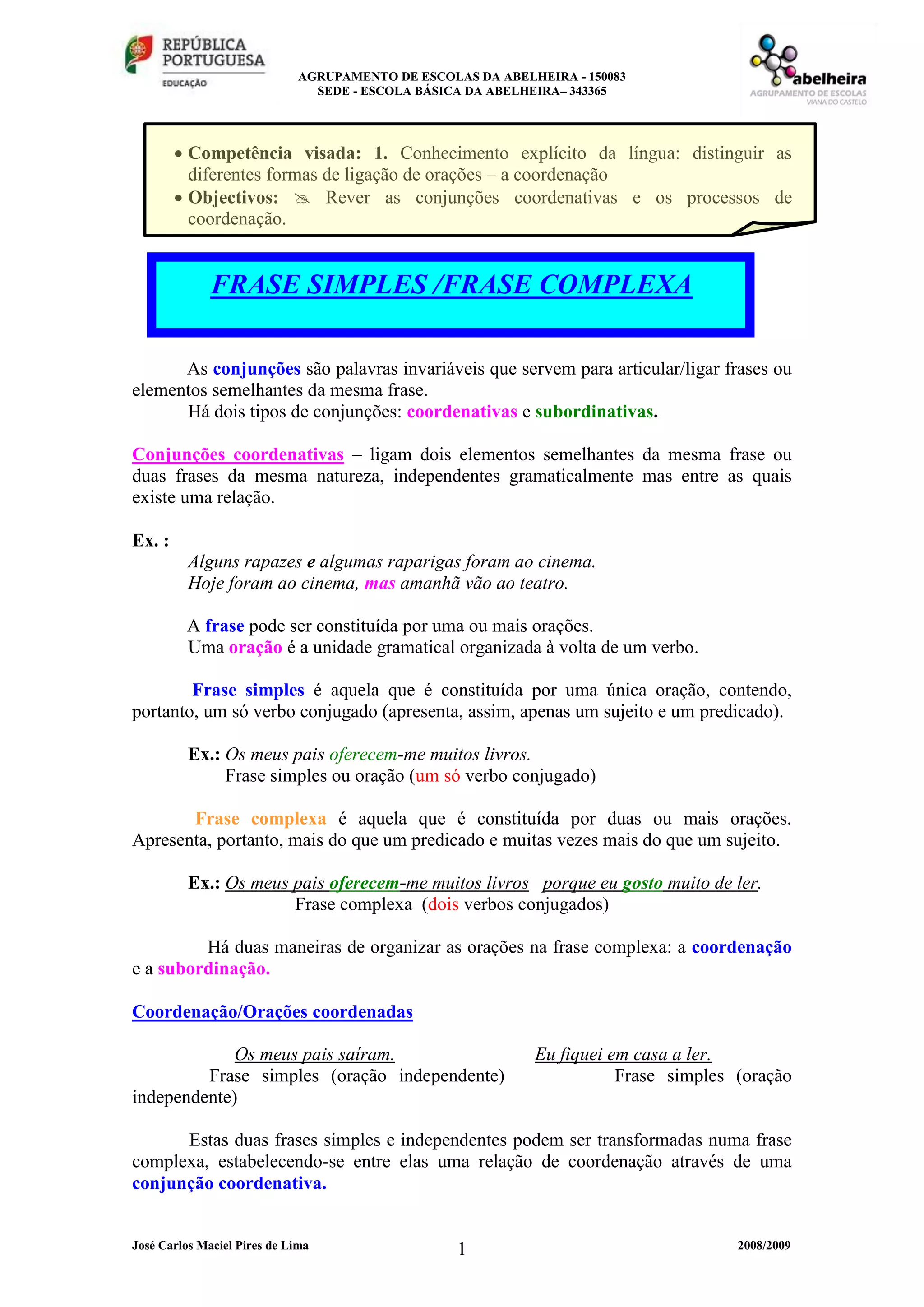 O documento trata das conjunções coordenativas e seus tipos, incluindo copulativas, adversativas, disjuntivas e conclusivas, com exemplos de relações entre orações. Explica a diferença entre frases simples e complexas, e como estas se organizam por meio de coordenação entre orações. Finalmente, inclui uma questão para autoavaliação sobre a compreensão do material apresentado.