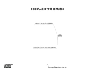 O documento descreve os dois principais tipos de frases: frases simples e frases complexas. As frases simples consistem de um único predicado, enquanto as frases complexas contêm mais de um predicado e podem ser coordenadas ou subordinadas.