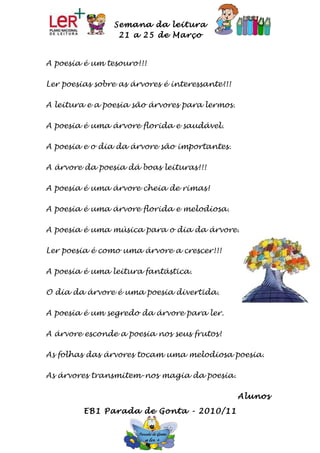 O documento anuncia uma semana da leitura de 21 a 25 de Março e faz várias comparações entre poesia e árvores, destacando que a poesia é como uma árvore florida e melodiosa que dá boas leituras, assim como o dia da árvore é uma poesia divertida.