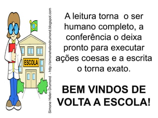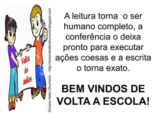 O documento dá boas-vindas aos alunos de volta à escola e enfatiza a importância da leitura, da conferência e da escrita para tornar o ser humano completo e pronto para executar ações coesas e exatas. Também cita Albert Einstein sobre como a mente que se abre a novas ideias nunca volta ao seu tamanho original.