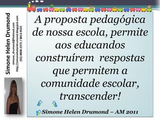 O documento apresenta uma educadora, Simone Helen Drumond, e descreve a proposta pedagógica de sua escola de focar no potencial de cada estudante e no sucesso escolar através do equilíbrio e boa conduta.