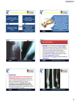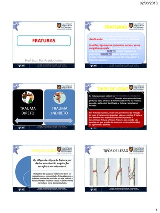 O documento discute fraturas ósseas, definindo-as como lesões potencialmente graves que danificam não apenas o osso, mas também partes moles circundantes. Detalha diferentes tipos de fraturas, sintomas, diagnóstico e tratamentos, incluindo imobilização, repouso e cirurgia. Também aborda complicações como infecção e consolidação viciosa.