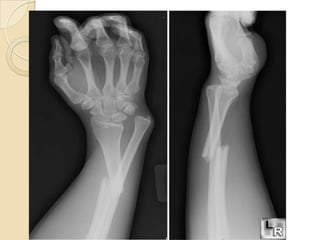 O documento discute fraturas do antebraço, especificamente: (1) as fraturas dos ossos do antebraço dificilmente se reduzem sem intervenção devido às forças musculares; (2) a importância de preservar os movimentos rotacionais do antebraço para manter a função da mão; (3) os principais mecanismos de fratura incluem compressão axial, flexão e rotação.