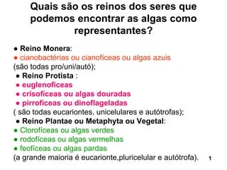 O documento descreve as principais características das algas encontradas nos três reinos biológicos: Monera, Protista e Plantae. No reino Monera estão as cianobactérias, no Protista estão as euglenofíceas, crisofíceas e pirrofíceas, e no Plantae estão as clorofíceas, rodofíceas e feofíceas. Essas algas variam em tamanho, estrutura celular, habitat e usos industriais e alimentares.